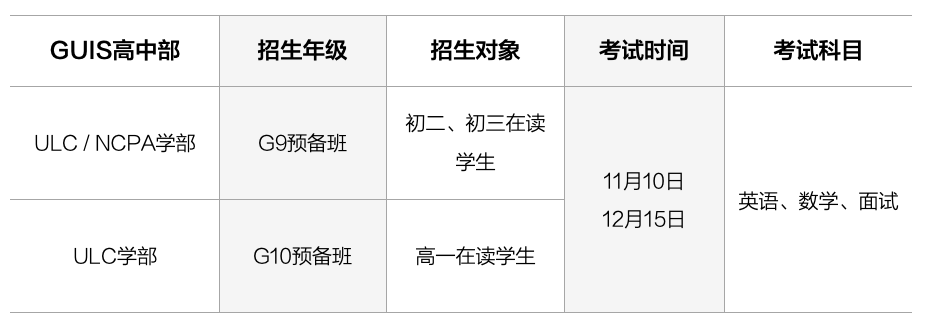 今日,广州优联国际学校(ULC&NCPA)发布了2024-2025学年春季班招生信息,有意向就读ULC&NCPA的家庭,千万别错过,一起来看看吧! 2024-2025学年招生信息 招生计划 所有有意申请GUIS高中部春季班的学生,均需参加入学考试。 招生政策 招生年级 GUIS春季班项目仅开放ULC/NCPA学部G9预备班、ULC学部G10预备班申请。各年级秋季班招生预计于12月启动,请留意学校官方信息发布。 G9预备班入学考试 ULC学部、NCPA学部G9预备班入学考试统一进行,学生可自由填写志愿申请ULC或NCPA,在符合录取条件的基础上,学校根据学生志愿发放录取。 澳洲海外课堂 GUIS春季班学生均需前往澳洲姐妹学校完成为期7-8周的海外课程,以提前适应学校常规的英语教学课程。 G10/11年级插班考试 NCPA学部全年接受插班申请,因插班学位有限,学校将根据实际情况择优录取,详情请致电招生办咨询。 录取方式 GUIS采取先考先录、额满即止的录取方式。如遇学位满额,校方有权取消后期相关年级的入学考试。 报名须知 1. 考生须通过招生入学系统完成入学考试报名。 2. 考生可选择参加不同日期的入学考试。不同日期的入学考试采用不同试卷,难度一致。 3. 考生若未能通过第一次入学考试,可申请补考未通过的科目。每位考生在同一招生年度内最多可报名参加两次入学考试。 4. 考试范围和相关要求请参考学校官网的考试大纲。 * 扫描二维码获取招生入学系统 * 校园参观 校园参观活动于每周二和周四下午2:30进行。学生/家长需提前通过系统(扫描上方二维码获取入学系统)预约,并根据指引参加活动。 关于ULC&NCPA ULC学部开设经英国剑桥大学考评院(简称CAIE)和英国培生爱德思(简称EDEXCEL)双授权的国际课程,课程包括IGCSE和A Level。ULC经CIS国际学校联盟委员会完全授信认证,至今已有十八届毕业生逾两千名,遍布包括牛津大学、剑桥大学、康奈尔大学、多伦多大学和香港大学等全球顶尖名校。ULC旨在培养“具有自主学习能力和批判性思维,身兼社会责任感,愿为世界做出积极贡献的中国全球公民”,为学生将来能顺利进入社会、拥有精彩的人生做好准备。 NCPA学部经美国国务院授权的权威认证机构WASC全面认证,核心管理层与教师均是以英语为母语的外籍专业教育人士,采用英语浸入式教学法和美国共同核心教学大纲,并以AP课程和AP顶石课程作为最高难度的学术课程。NCPA提供全面的文理通识教育和丰富的课外活动项目,帮助学生实现学业和社会行为上的卓越表现,致力于将学生培养成具备高效协商、合作学习、灵活筹划能力及有气节操守的实践者。历届毕业生均受到美国、加拿大、英国、澳大利亚、瑞士、中国香港等全球众多名校的青睐。 想要了解更多关于 广州优联国际学校(ULC&NCPA)的最新资讯 欢迎扫码添加李老师详细咨询