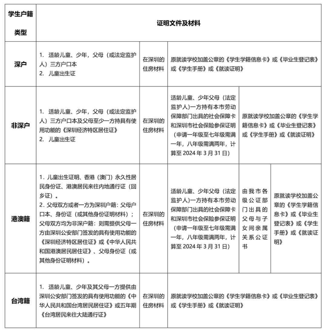注:住房材料指适龄儿童、少年父母(或祖父母、外祖父母、法定监护人)一方的深圳市内商品房房产证或不动产权证(产权份额≥51%)、原著居民住房、安居型住房、房屋租赁凭证(信息)、其他类住房(含自建房、军产房、集资房、小产权房、父母一方网格居住信息登记、商务公寓、集体宿舍等)证明材料之一。(以上住房房屋用途必须是住宅)