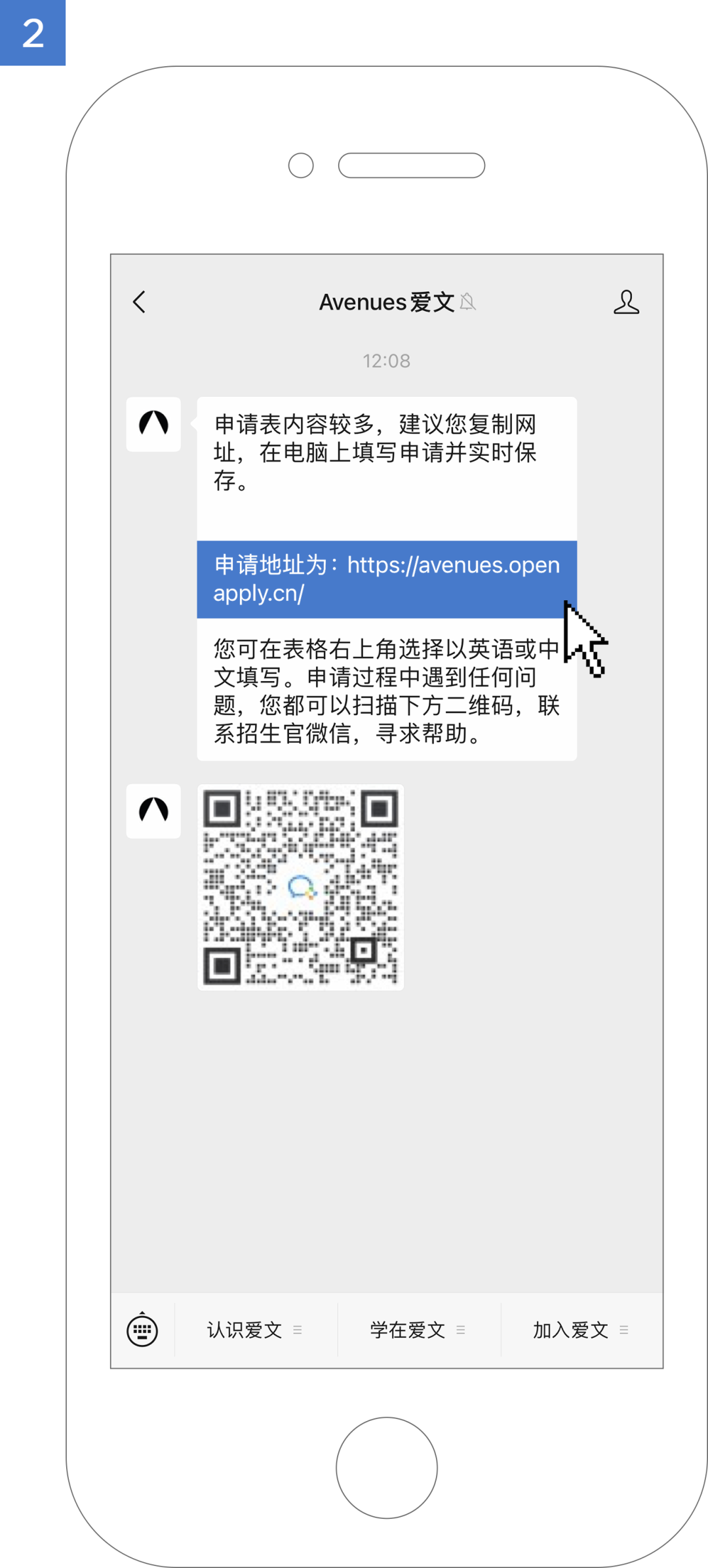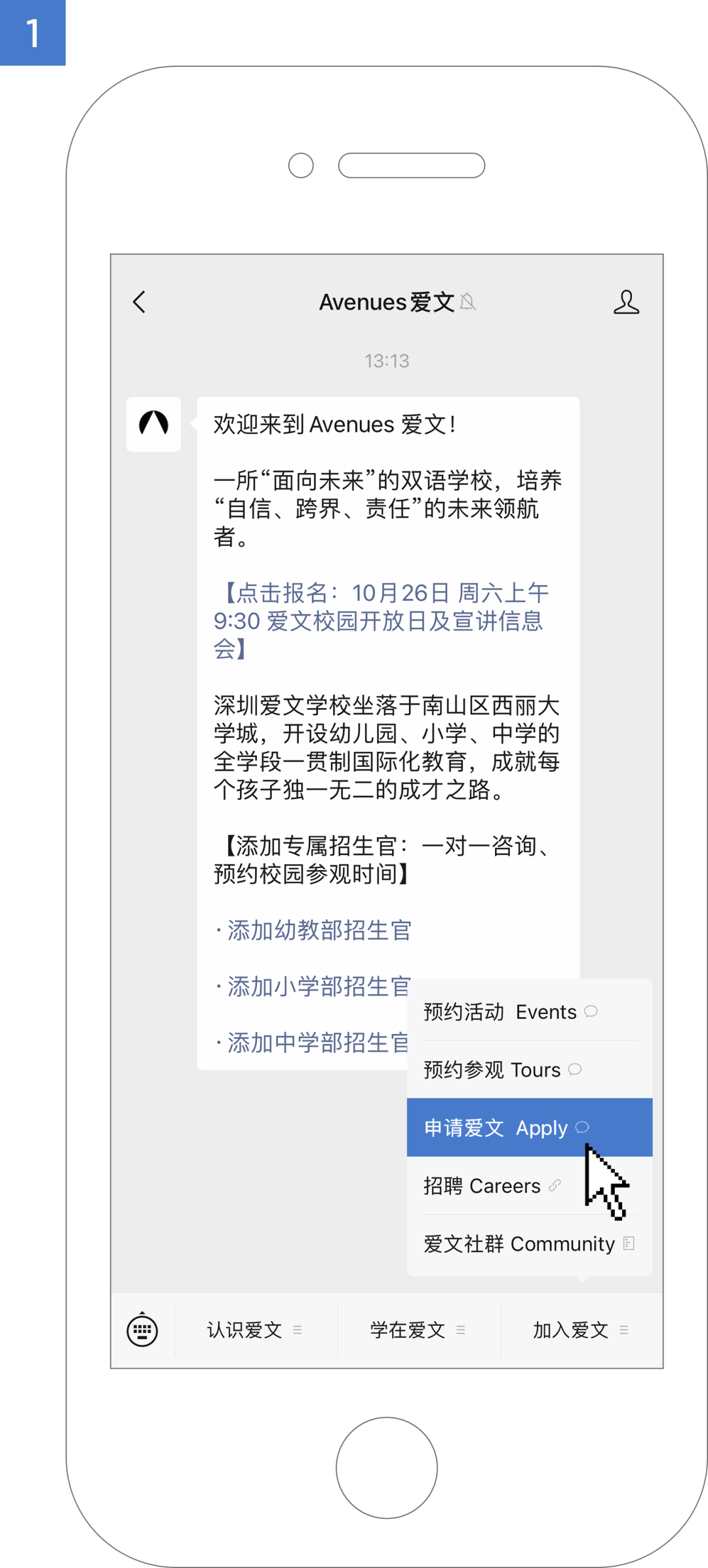 家长可参照图示,在公众号菜单栏页面依次点击“加入爱文”、“申请爱文”,点击申请链接并递交申请,依次填写相关信息。