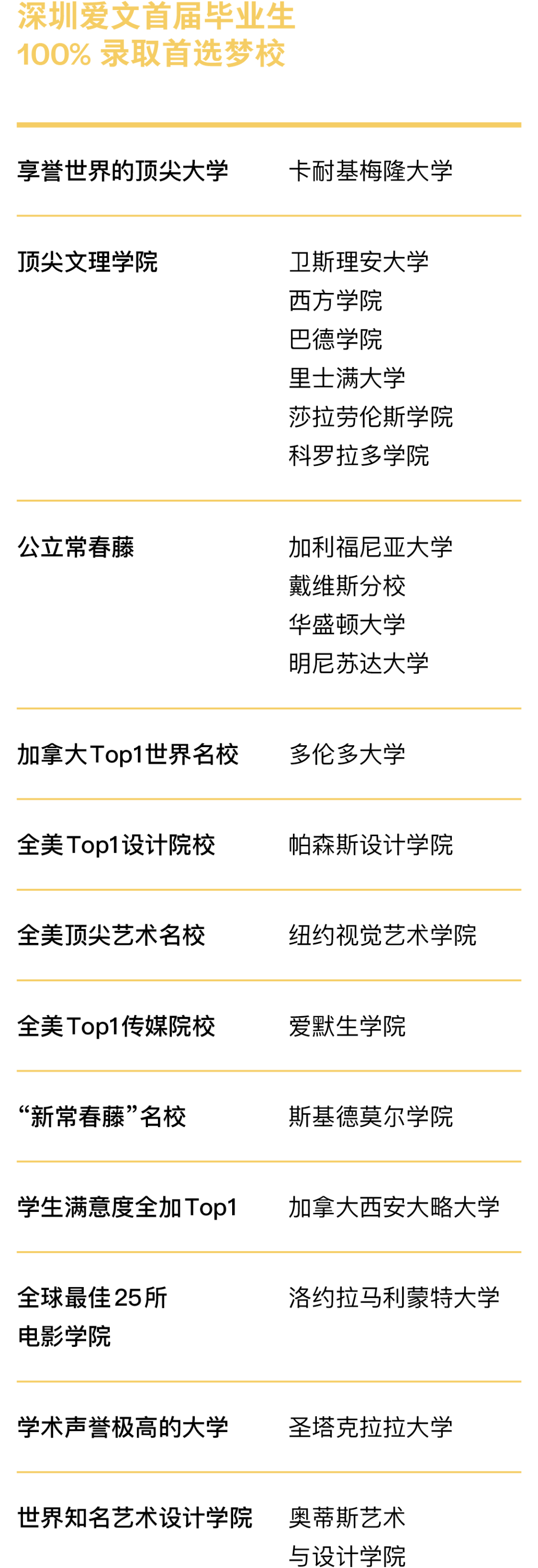 同时,爱文专业的大学升学顾问团队从九年级开始到十二年级,为每一位学生的个性化升学之路层层铺垫、加持。