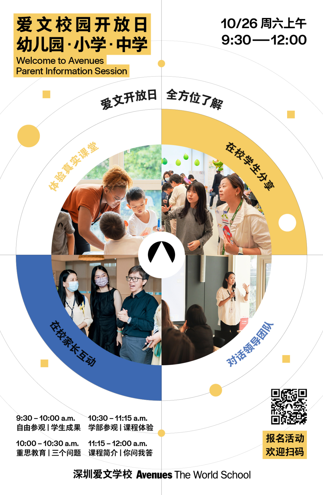 学校将在10月26日(周六)举行校园开放日,感兴趣的家庭,抓紧预约啦!来爱文进行一场深度体验,参与爱文体验课,参观学生成果展,全方位了解爱文,一起探索“何为面向未来的教育”。