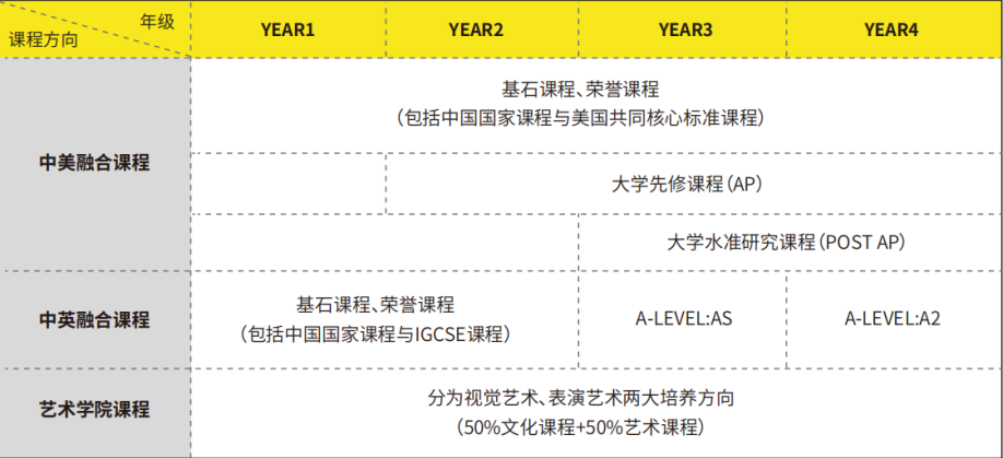 书院开设三大课程体系:中美融合课程(US Track)、中英融合课程(UK Track)和艺术方向(VMAA,即万科梅沙书院·艺术学院)。