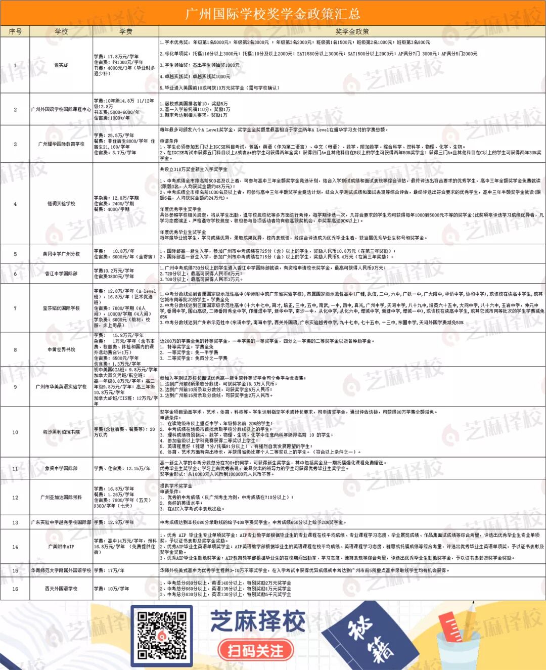 从上面整理的16所广州国际学校的奖学金政策中,我们可以简单地发现每所学校的政策都不重样。有的会侧重于入学时候的成绩,有的会侧重于在学习阶段的标化考试成绩,有的则侧重于升学的录取。