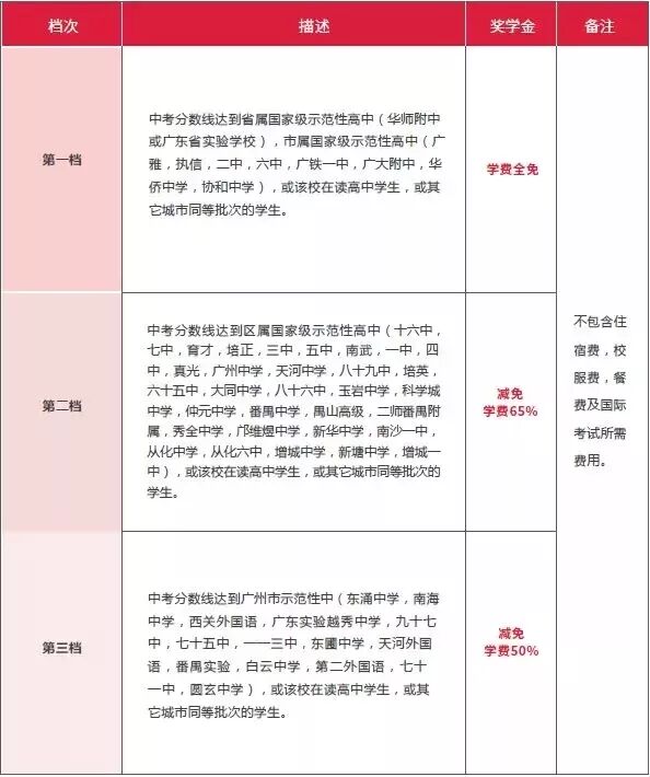 2、国际部高一新生入学,参加广州市中考成绩在715分(含)以上的学生,奖励人民币5.4万元(在第三年奖励)。